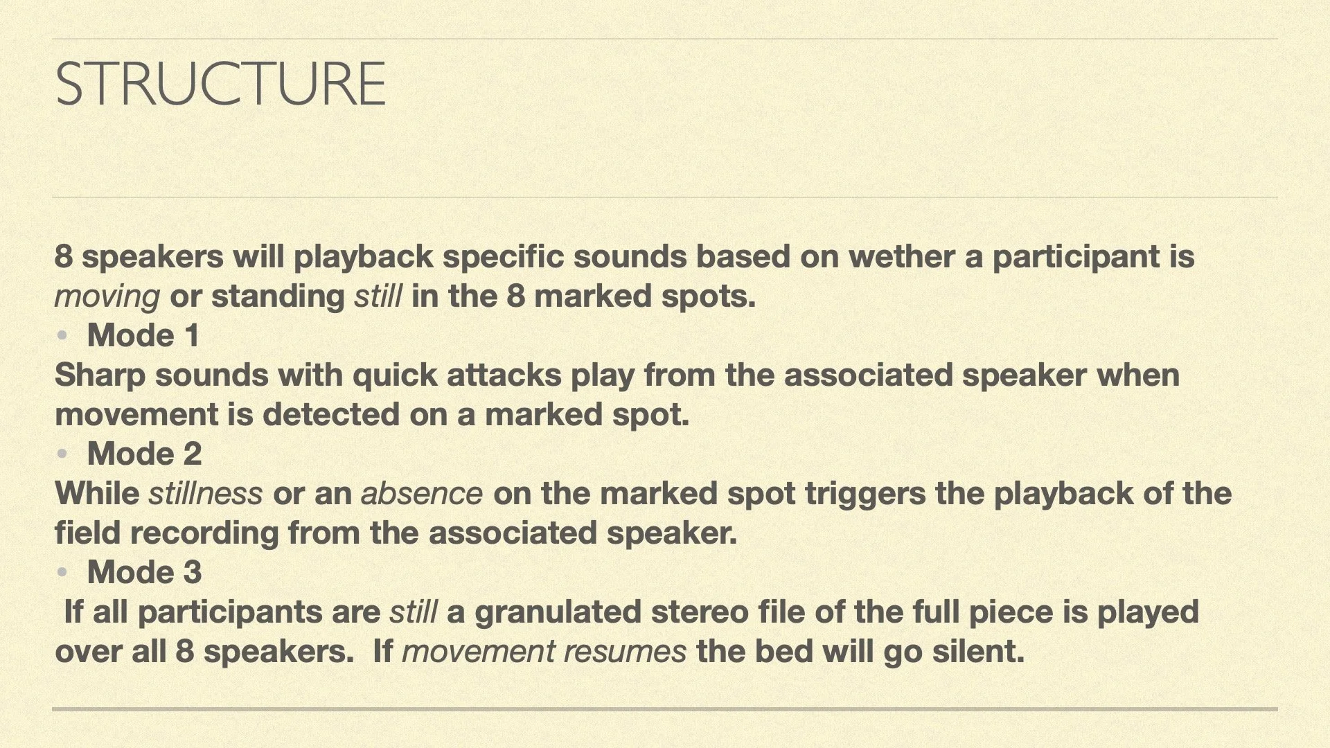 • Mode 3 If all participants are still a granulated stereo file of the full piece is played over all 8 speakers. If movement resumes the bed will go silent.